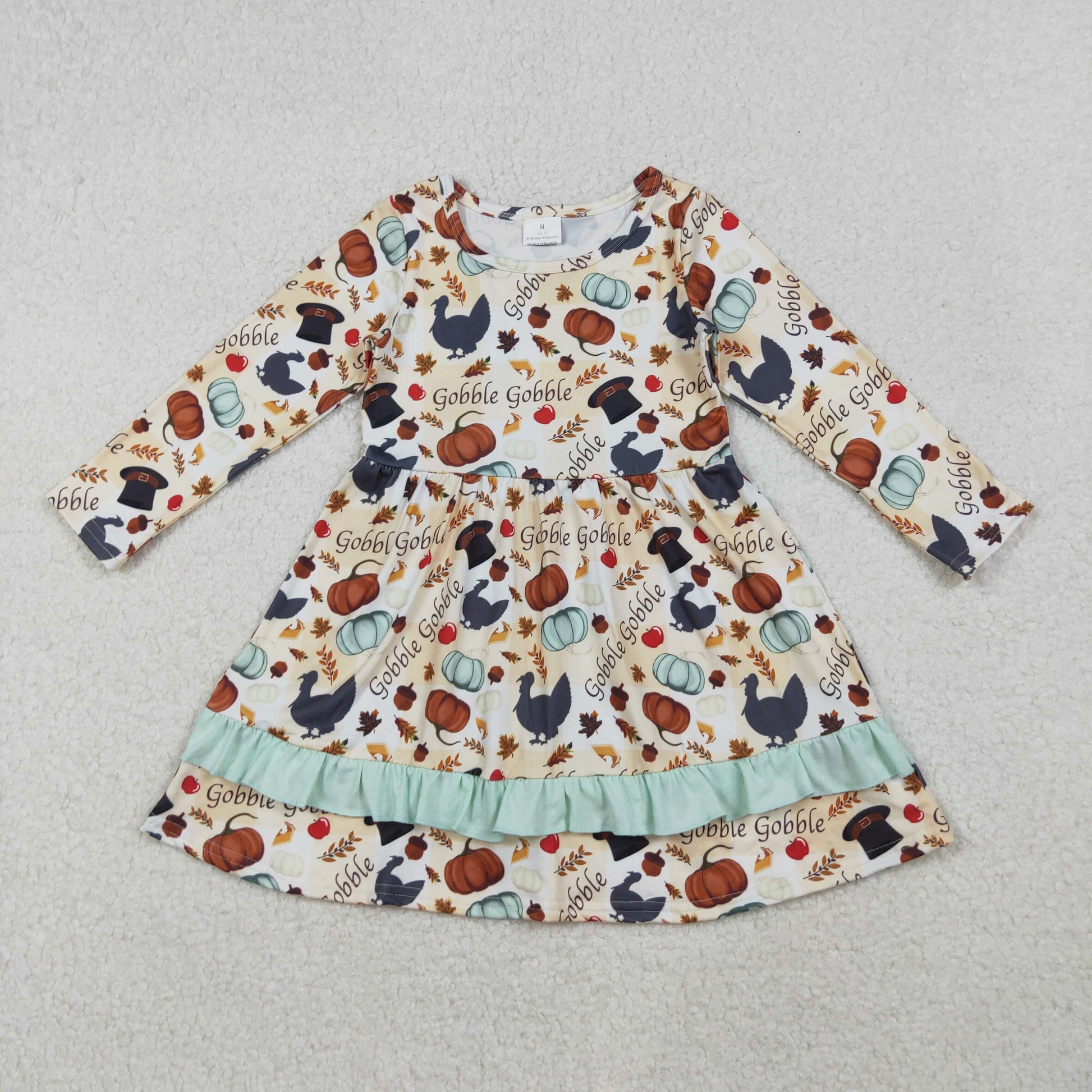 GLD0789 Baby Girls Turkey Pumpkins Thanksgiving Ruffle Knee Length Dresses