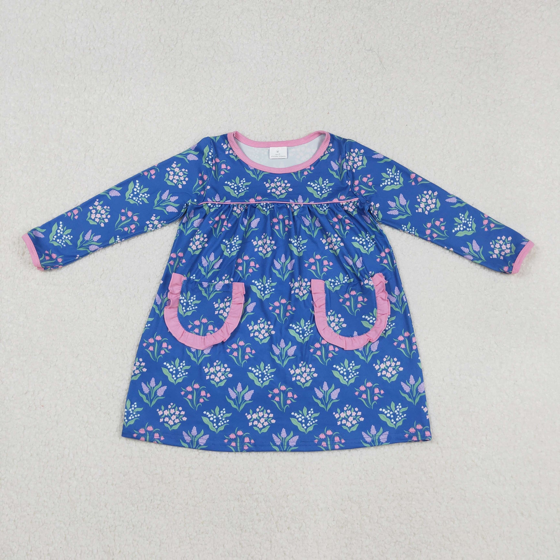 GLD1257 Baby Girls Pink Flowers Plaid Ruffle Pockets Knee Length Dresses