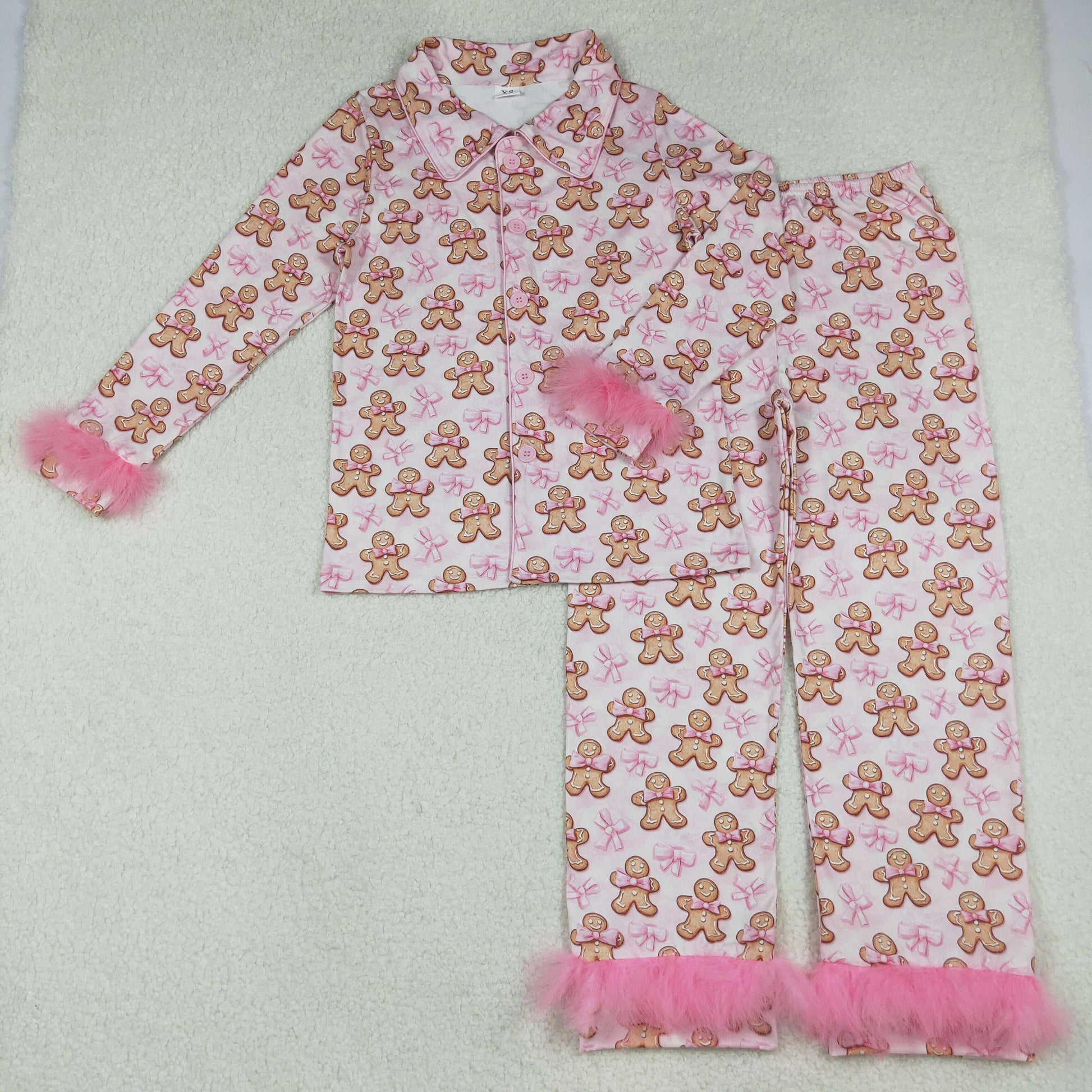GLP2716 Adult Women Pink Bows Gingerbread Button Top Pants Christmas Fur Sleeve Pajamas Set