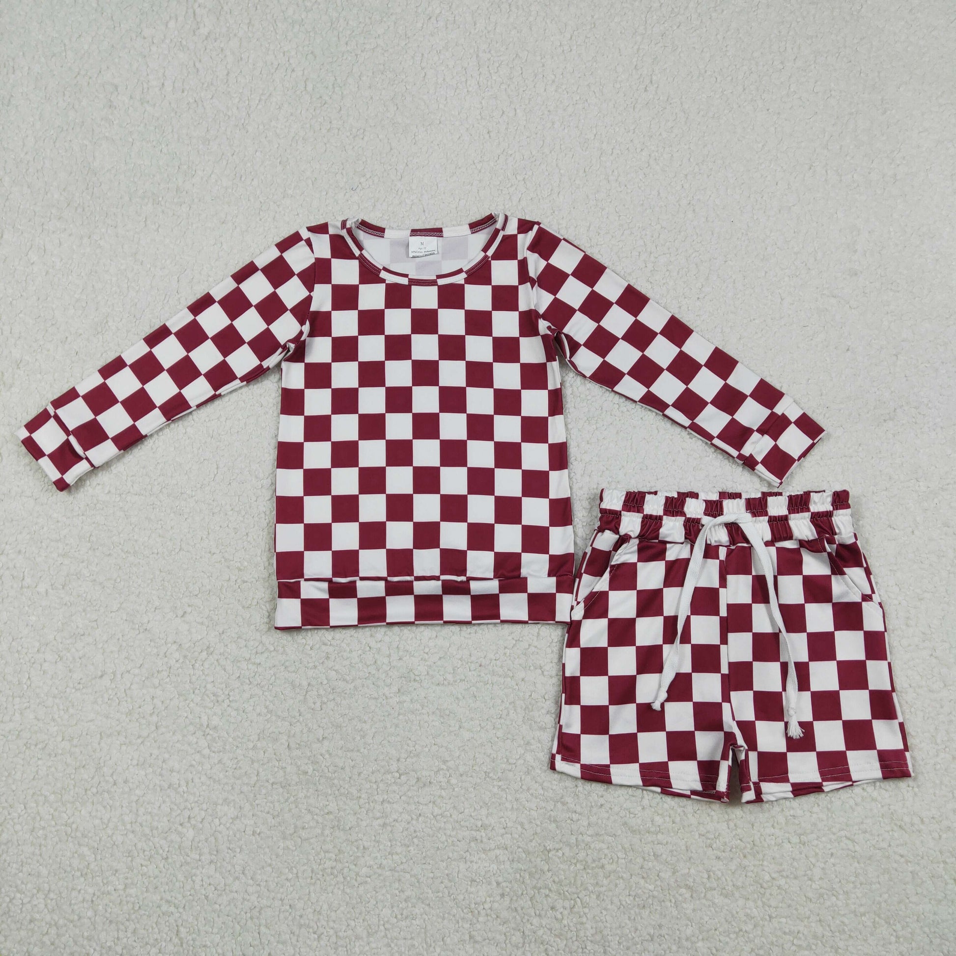 GLS0053 Baby Girls Dark Red Checked Long Sleeve Top Pockets Shorts Clothes Sets