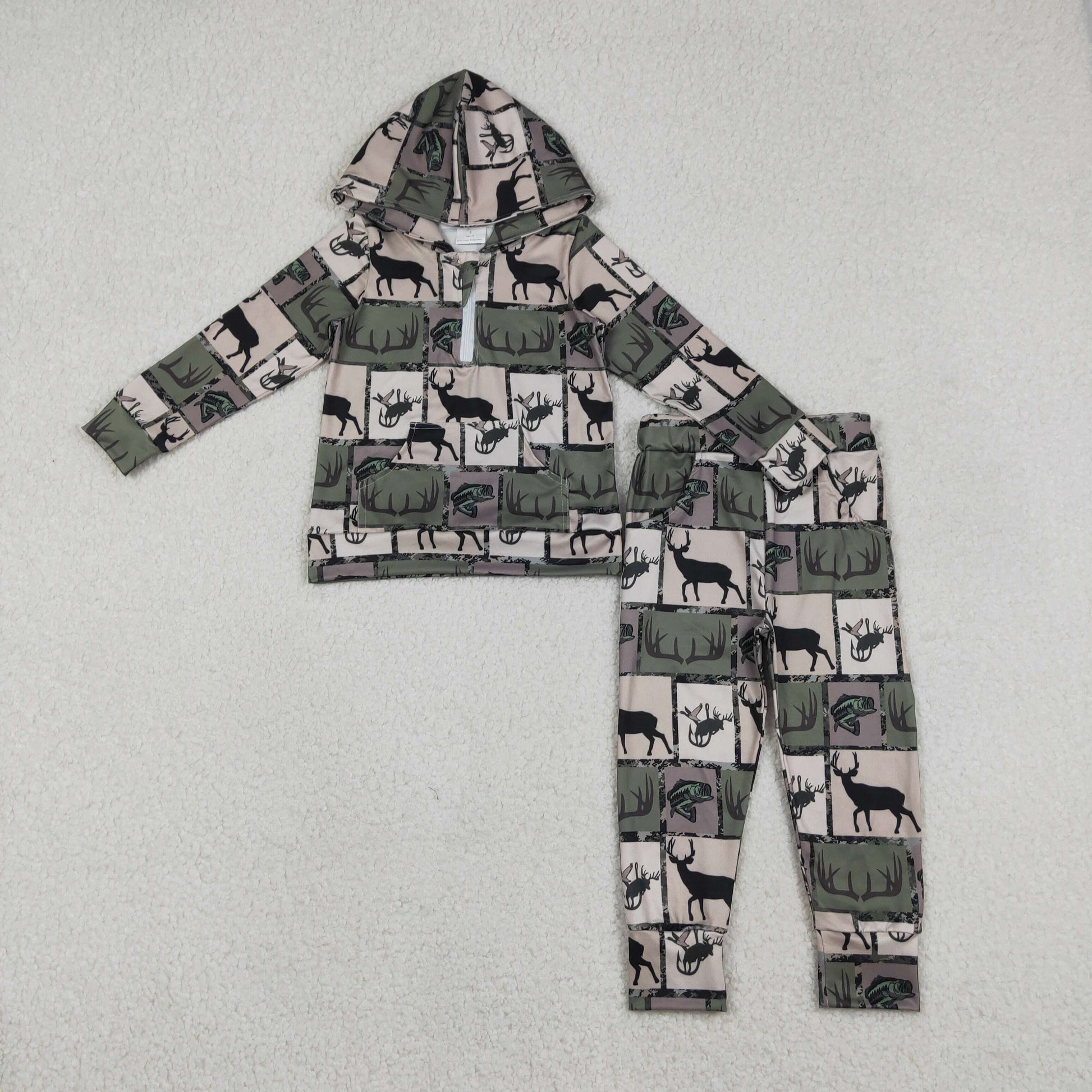 BLP1368 Baby Boys Deer Fishes Zip Pockets Hoodies Jogger Pants Hunting Clothes Sets