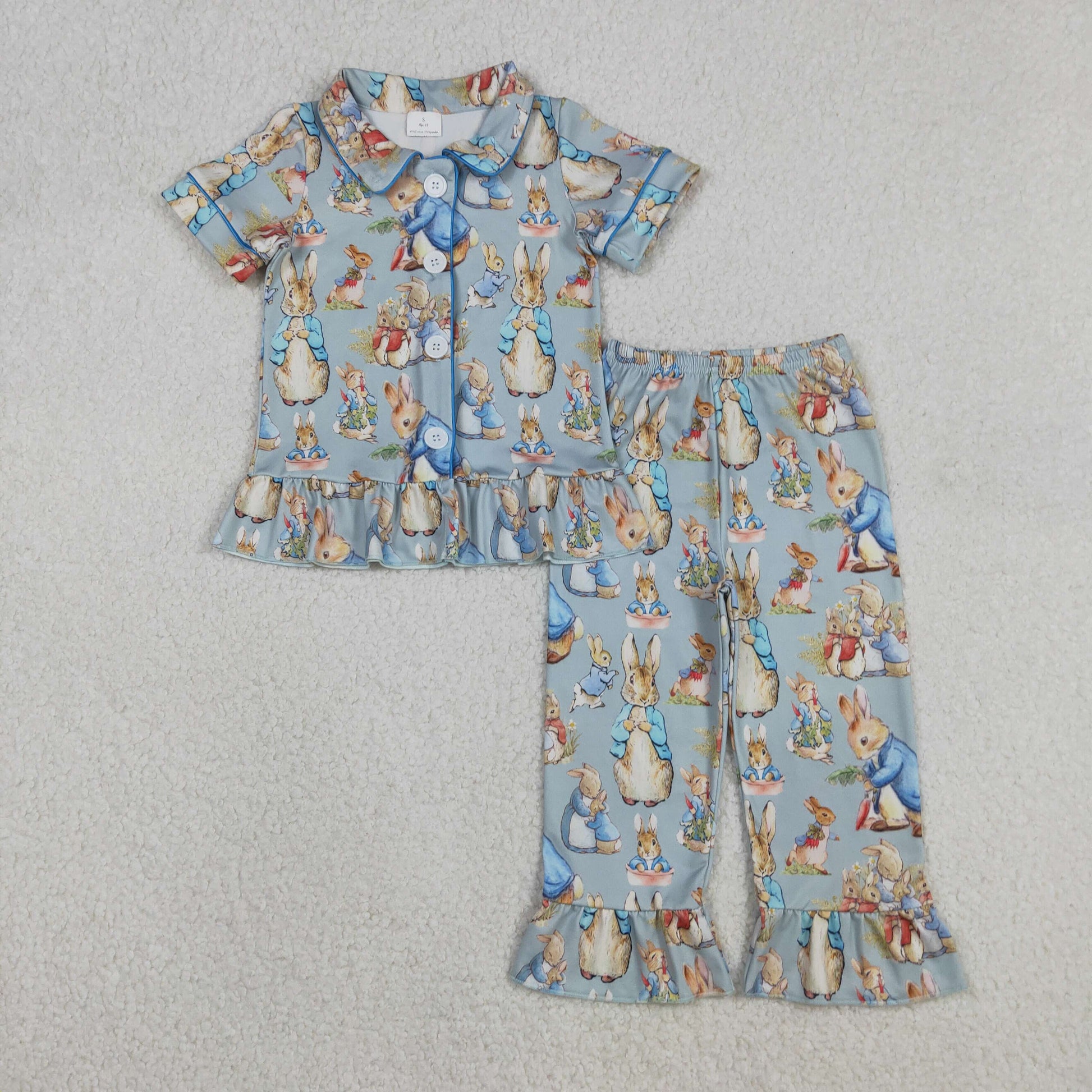 GSPO2097 Baby Girls Rabbits Flowers Button Top Ruffle Pants Easter Pajamas Sets