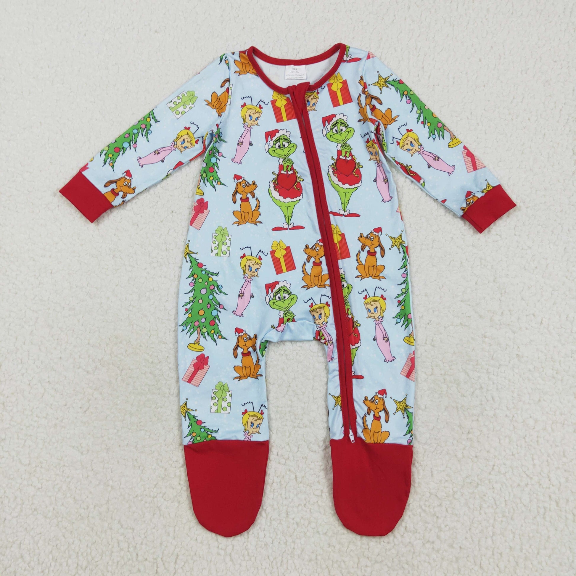 Sibling Baby Boys Green Face Miss Christmas Pajamas Set Zipper Footed Romper
