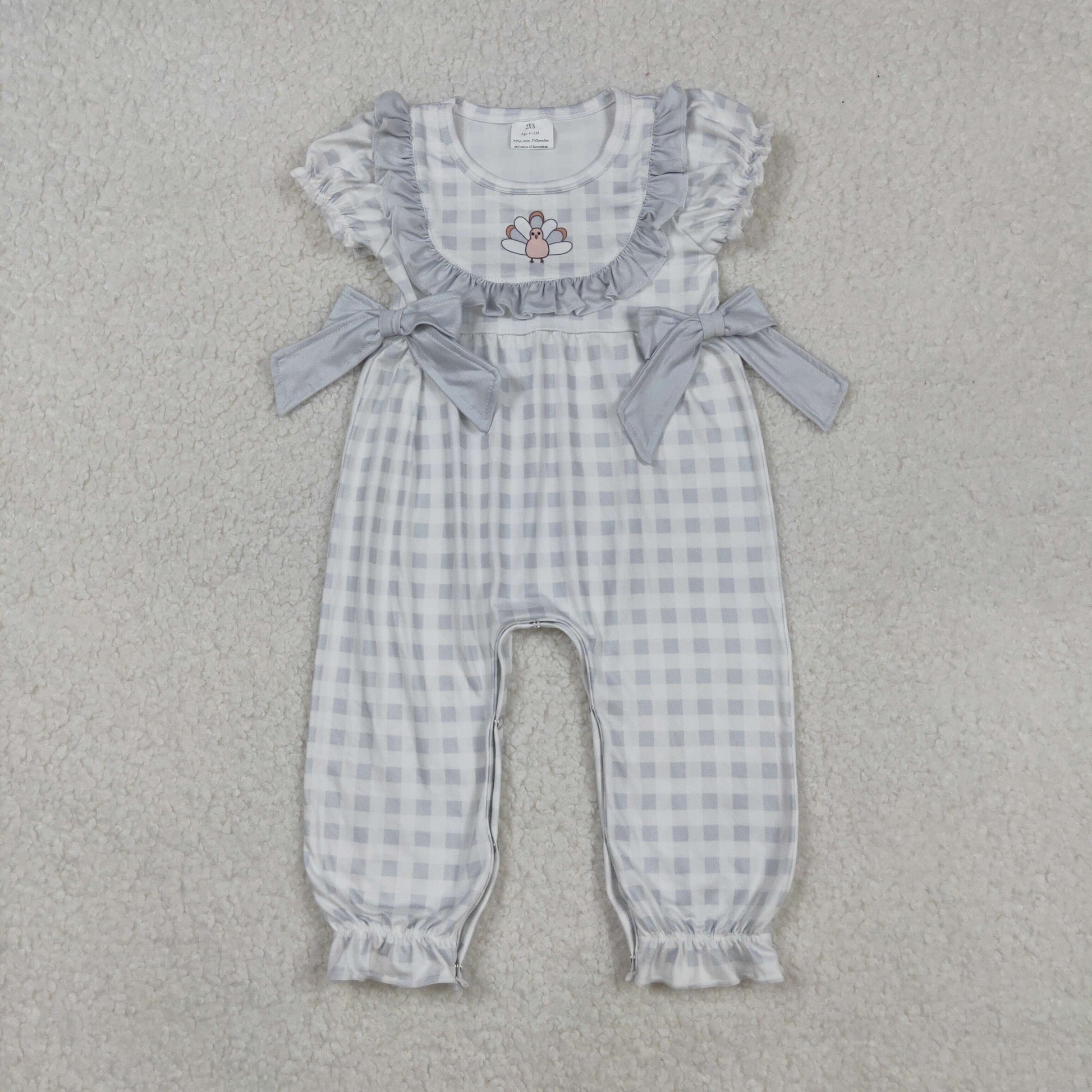 SR1970 Baby Girls Grey Checked Embroidery Turkey Bows Thanksgiving Ruffle Footie Rompers