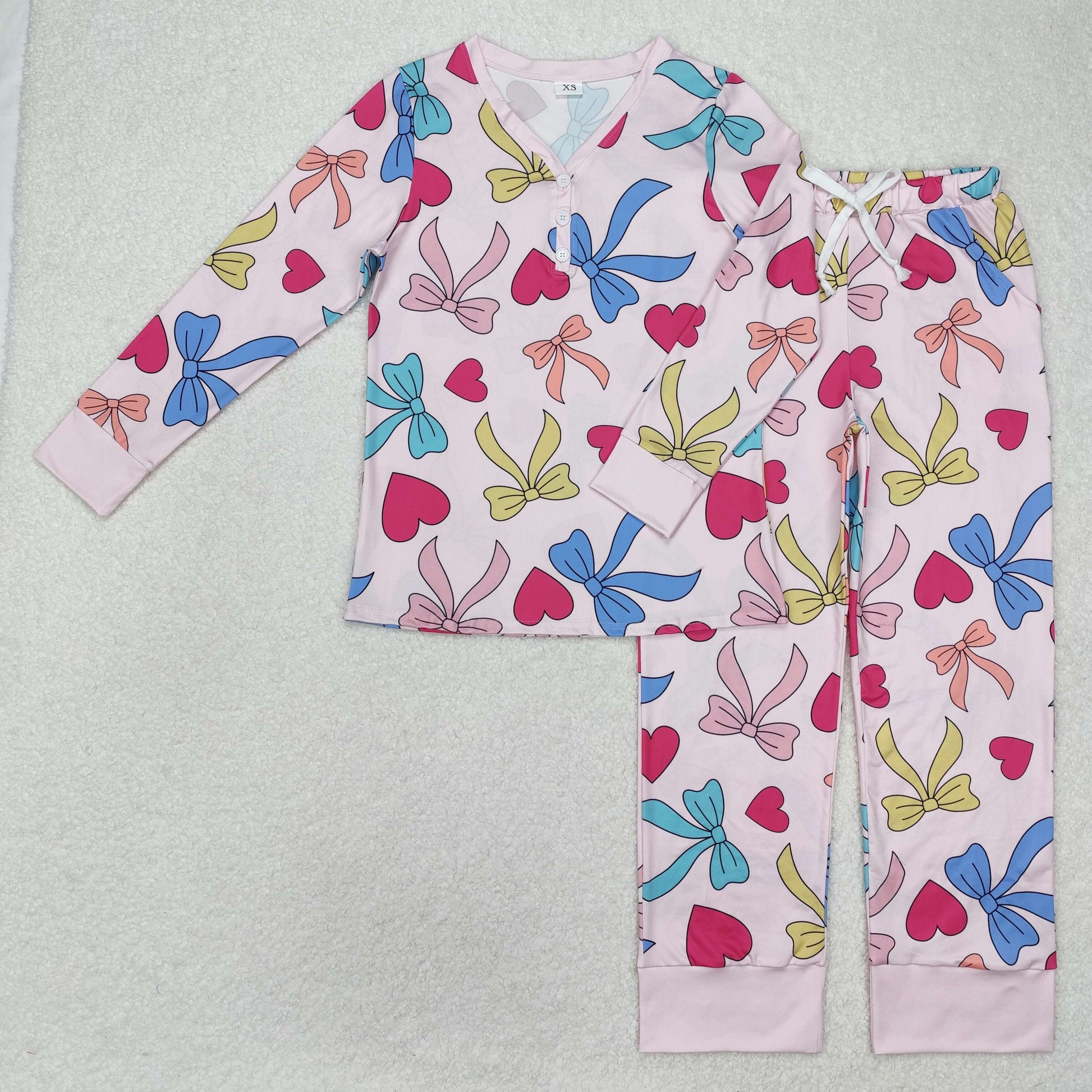 GLP2275 Adult Women Colorful Bows Hearts Button Top Pants Valentine Pajamas Set