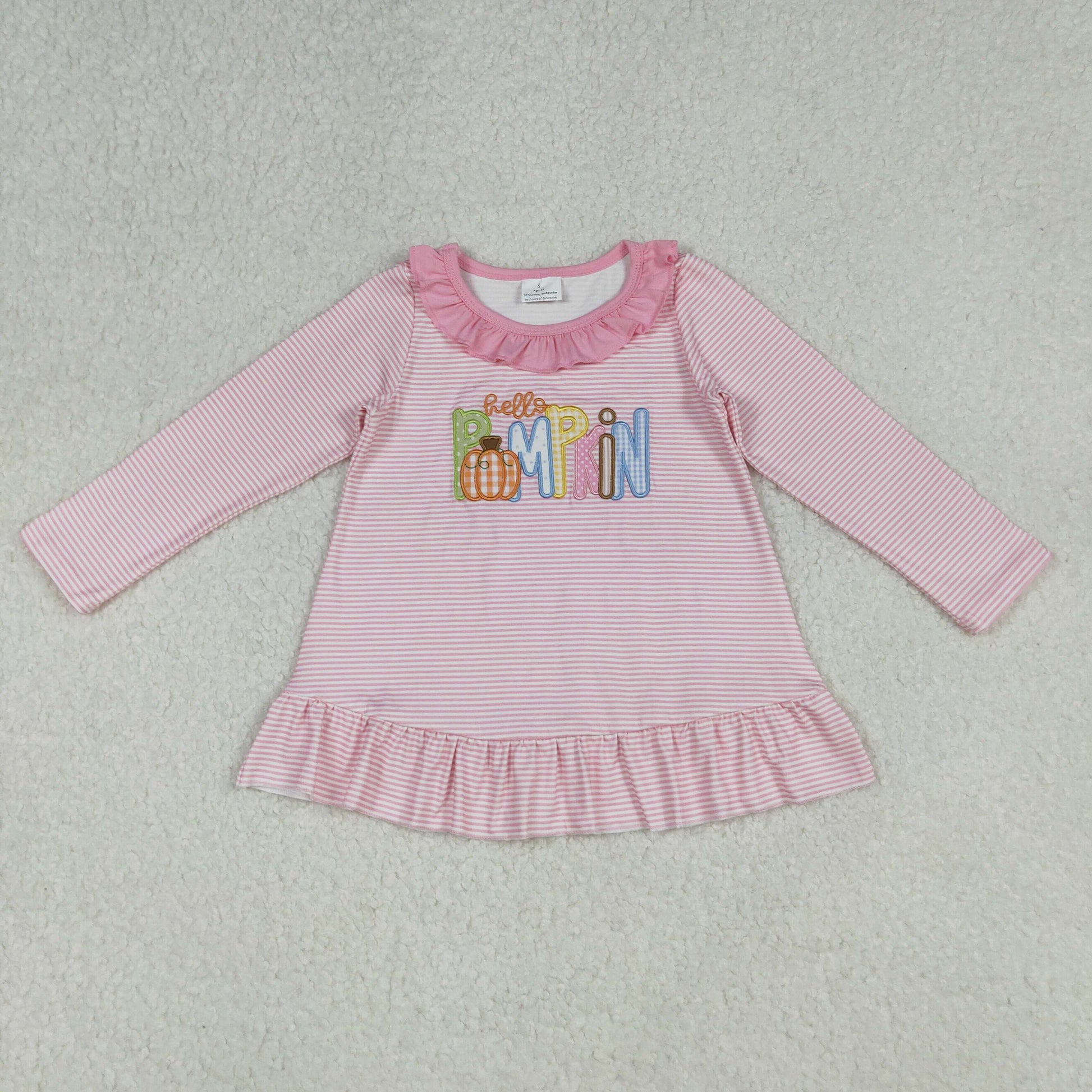 GT1183 Baby Girls Pink Stripe Long Sleeve Embroidery Pumpkins Fall Ruffle Shirts Tunic