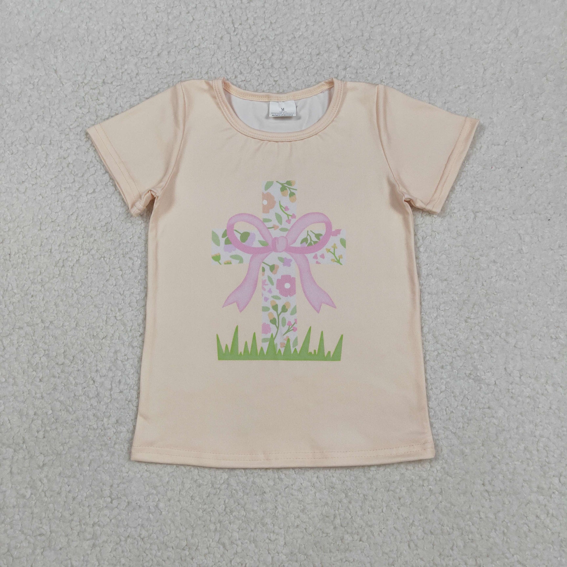 GT1297 Baby Girls Short Sleeve Bows Flowers Cross Easter Tee Shirts Top