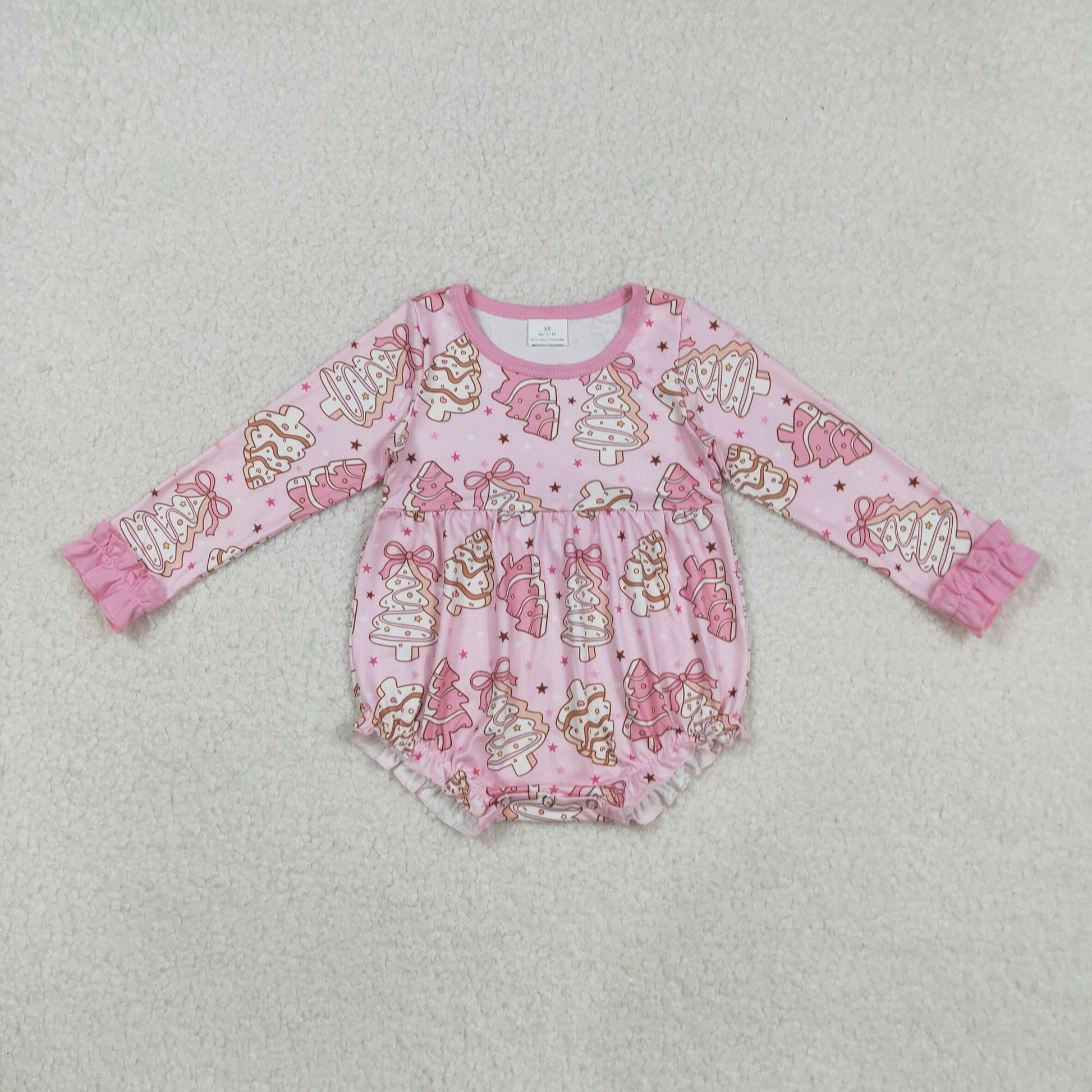 LR2301 Baby Girls Long Sleeve Pink Stripe Trees Stars Christmas Ruffle Rompers