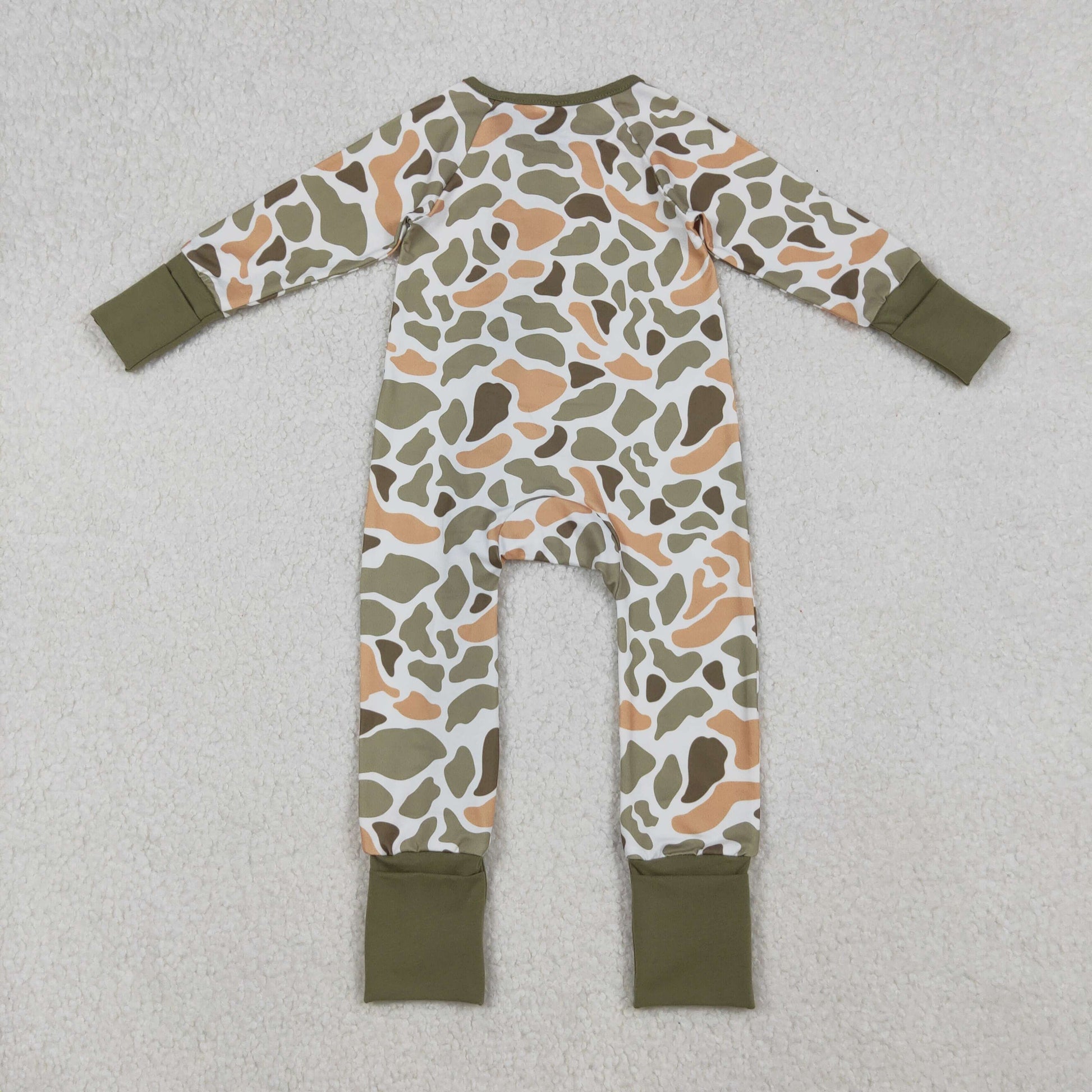 LR2578 Baby Boys Green Orange Camo Southern Zipper Footed Rompers