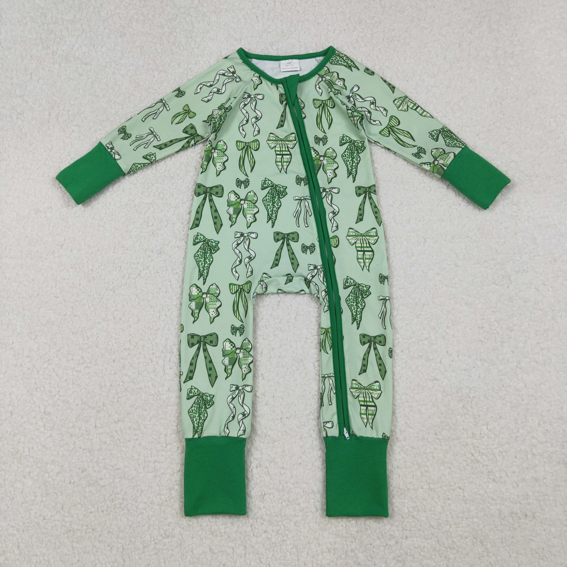 LR2654 Baby Girls Green Clovers Bows Plaid St Patrick Zipper Footed Rompers