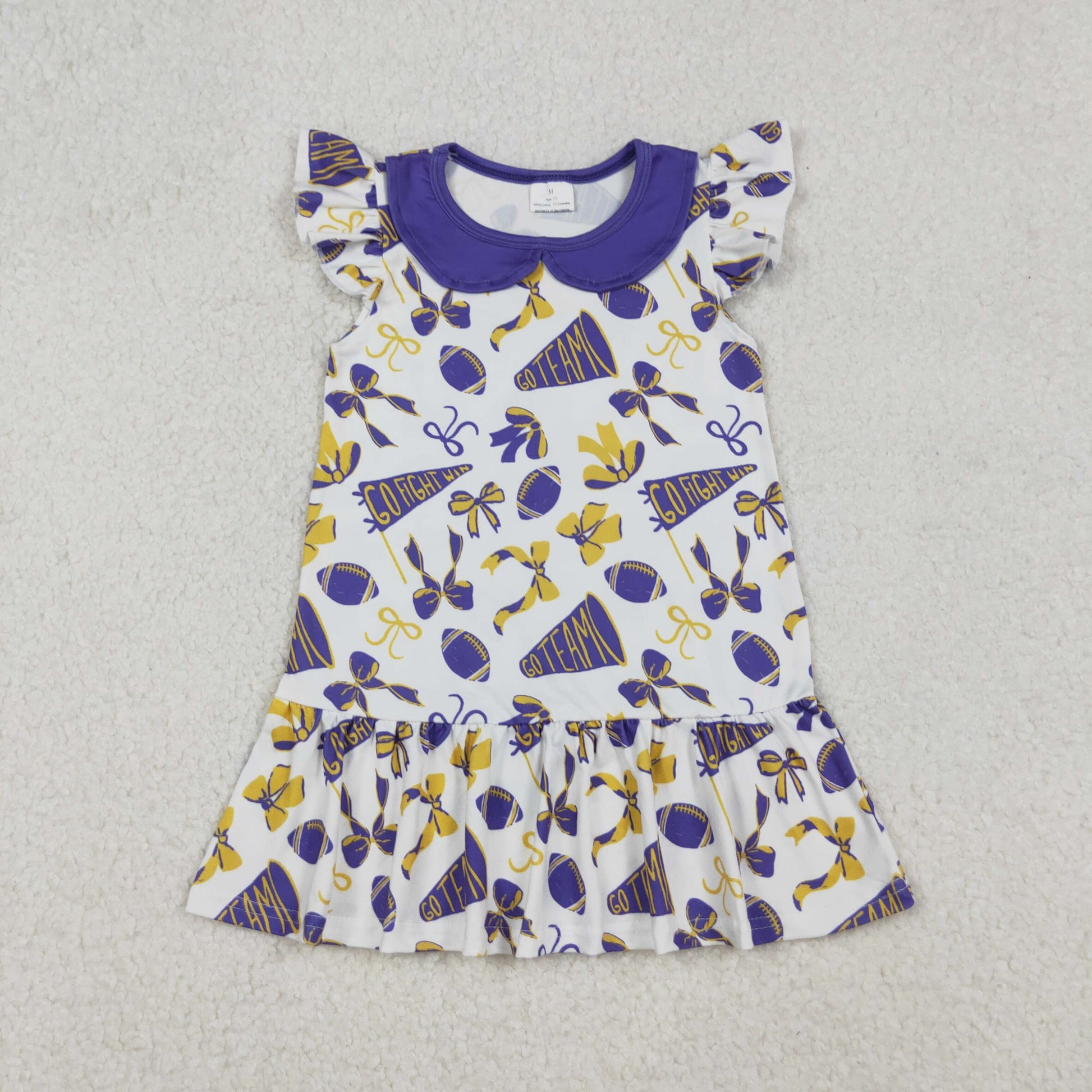 Sibling Baby Girls Purple Bows Footballs Go Team Ruffle Zipper Romper Knee Length Dress