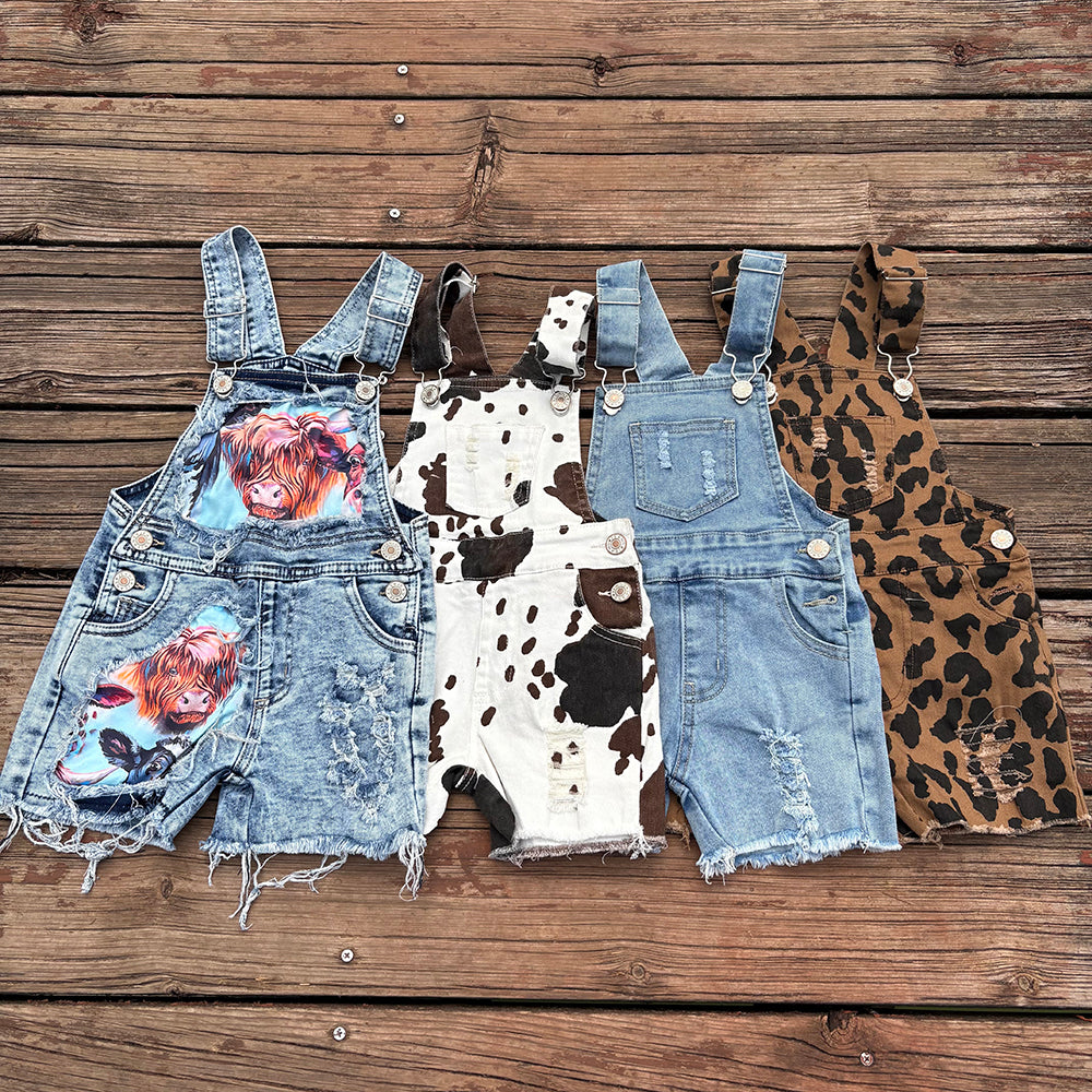 Sibling Baby Kids Western Denim Cow Bib Overall Jumpsuits
