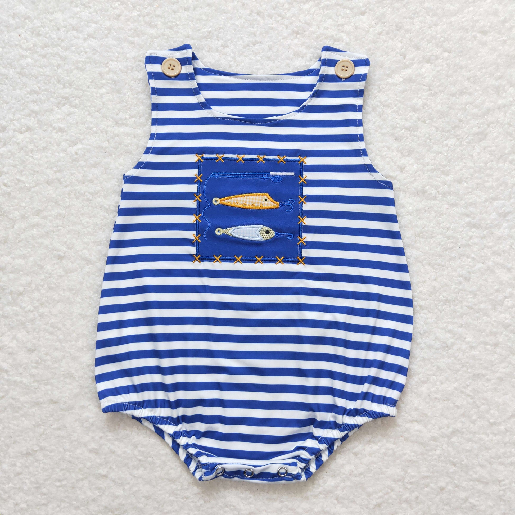 Sibling Brother Baby Boys Embroidery Fishing Blue Stripes Summer Clothes Sets Rompers
