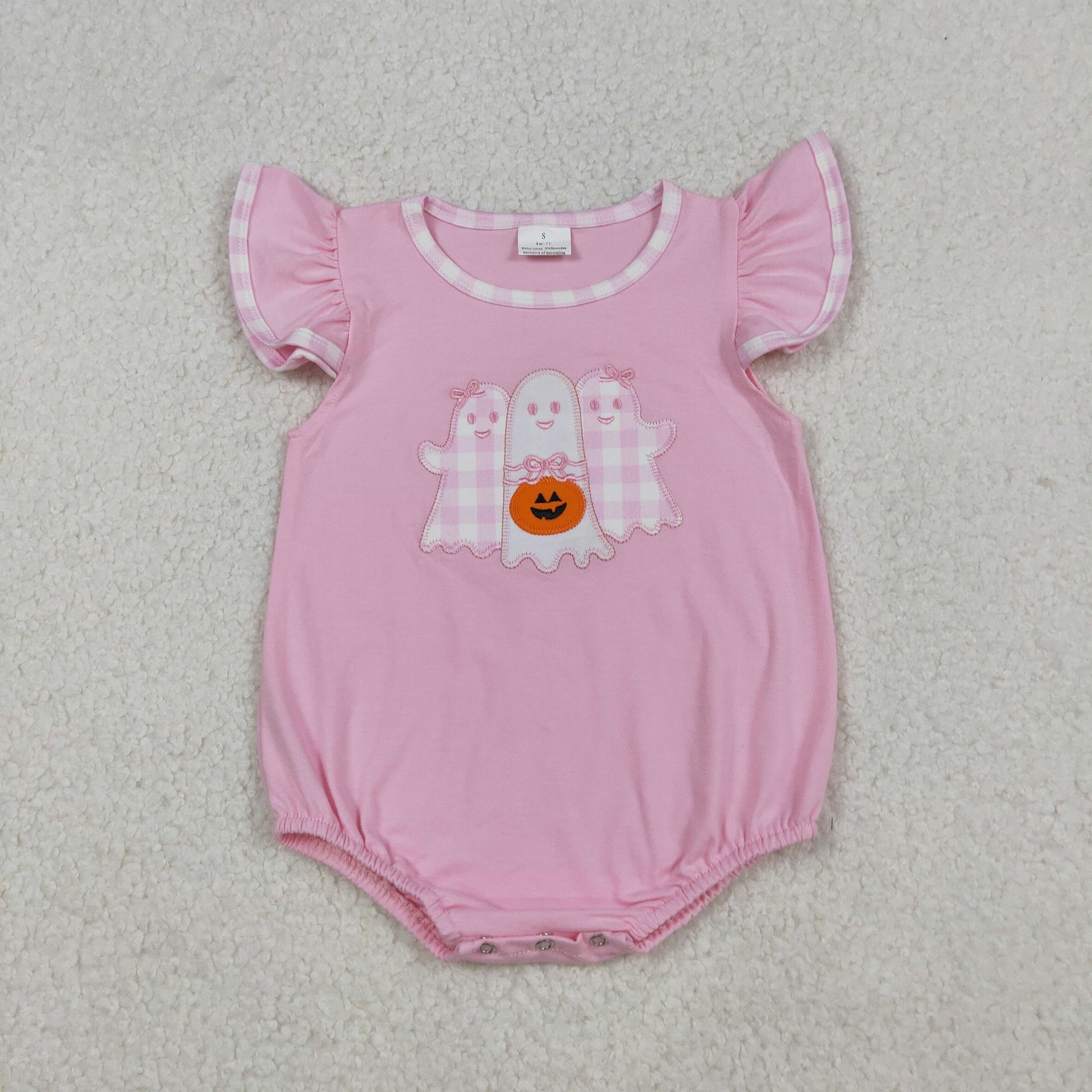 SR3196 Baby Girls Pink Flutter Sleeve Embroidery Ghost Pumpkins Halloween Ruffle Rompers